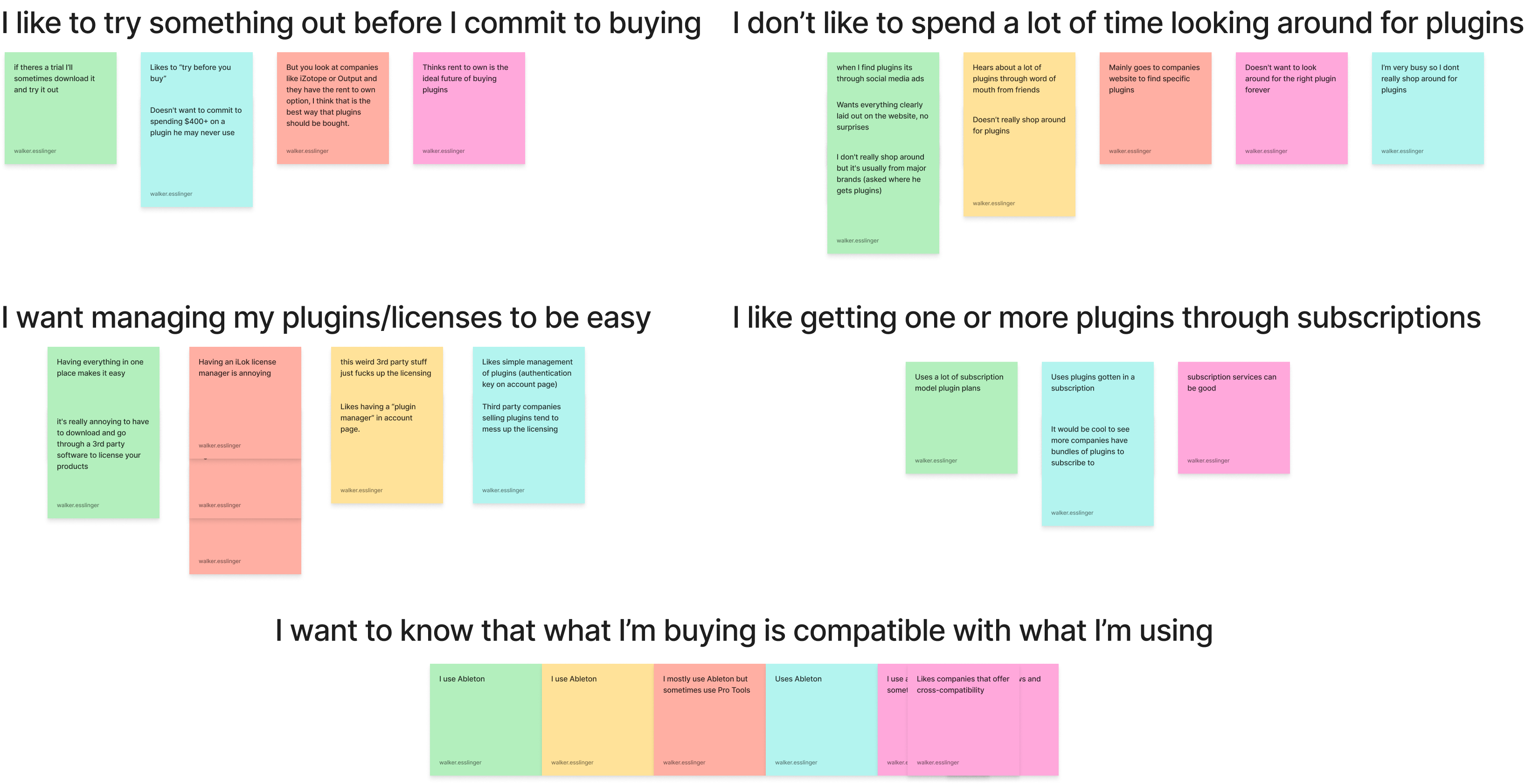 The researching portion consisted mainly of interviews with these producers and musicians, then looking for trends within that data through affinity mapping. Producers unanimously agreed that information about compatibility and system requirements needed to be clearly labeled and easily accessible from the product page. Along with this, everyone also noted that they usually go to a website for VST plugins looking for a specific need and don’t really want to spend time browsing around, and that managing plugins should be easy and hassle-free.