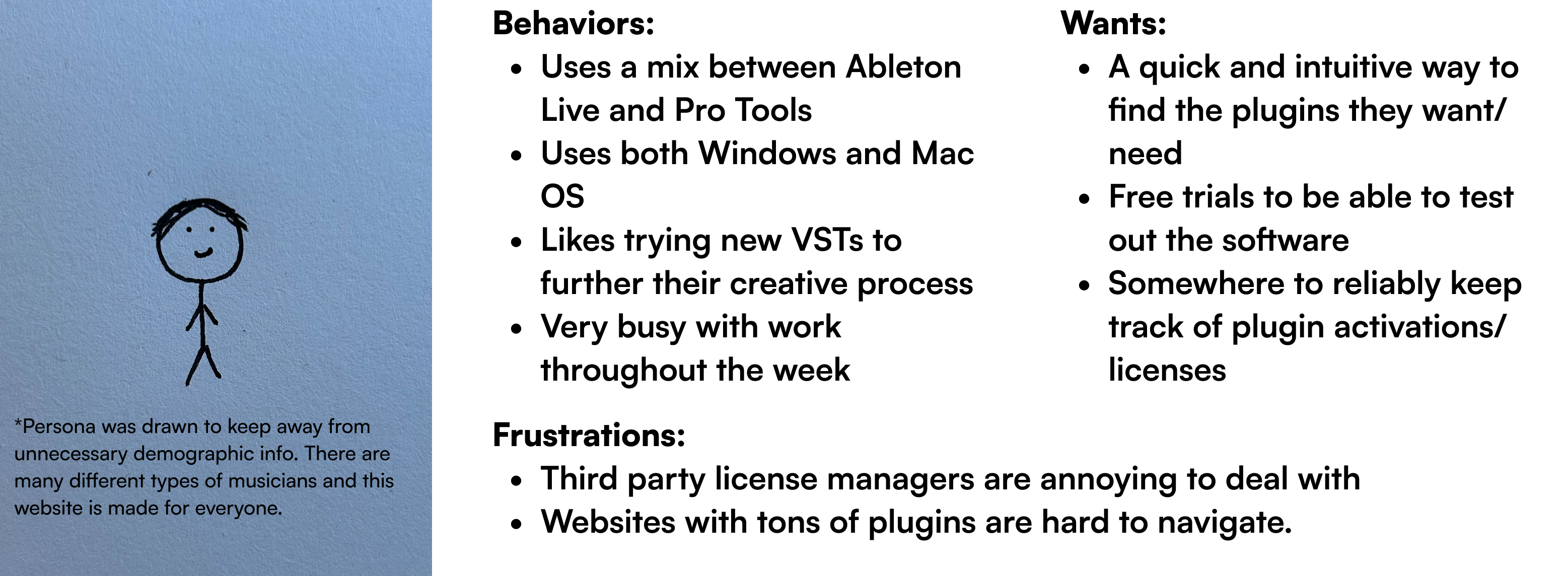 All of this research led to our persona, Sunny. Sunny is your average musician/producer who uses a combination of different software to create music. They like to try new plugins and see what they like but get frustrated when plugins are hard to find or don’t actually describe what they do. Along with this, managing licenses for plugins has only gotten more complicated with every company having their own method or third-party software, adding to the stress of downloading new software.