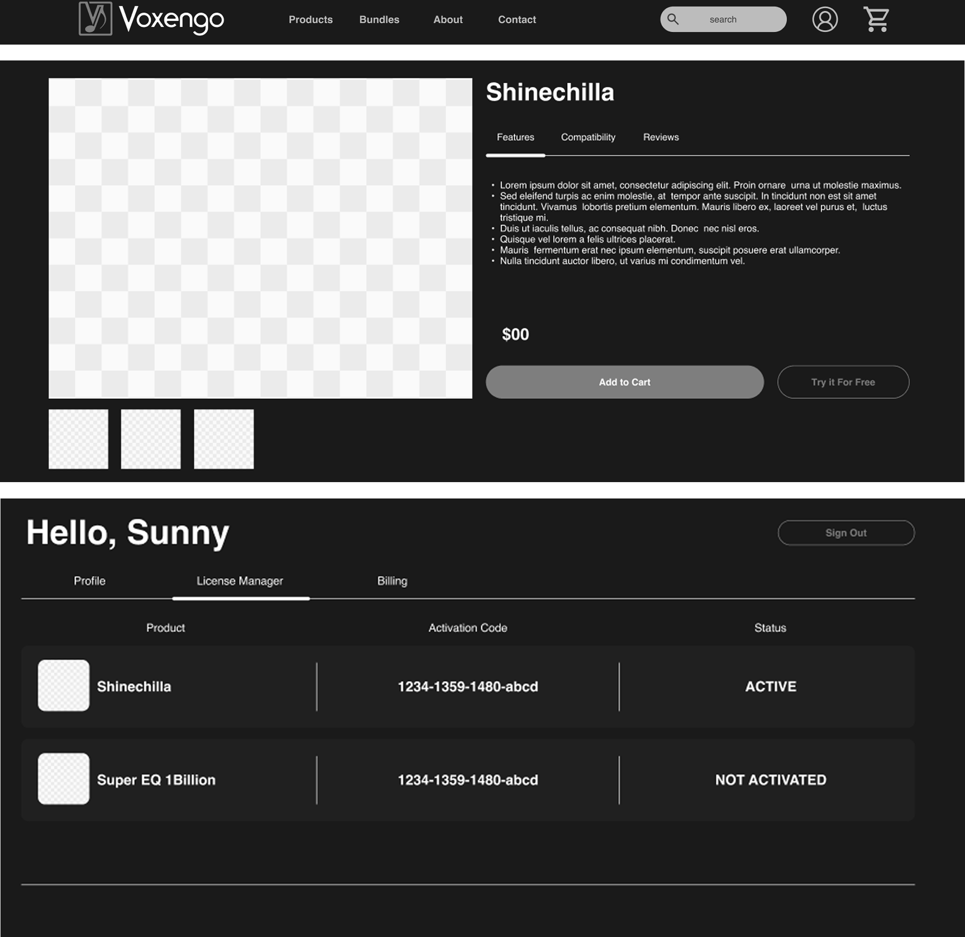 When sketching and designing wireframes, the biggest improvements I planned to make were adding top-level navigation, simple product and license management, and making product pages with clear information and purchase buttons.