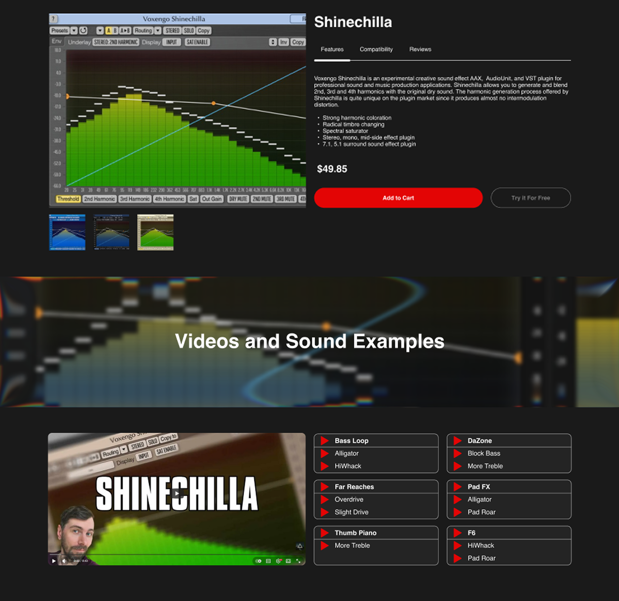 Product pages feature general information about the software and sound/video examples, as well as compatibility info, price, and clear buttons to add to cart or get a demo.